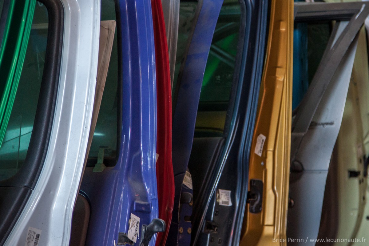 Le but ici n’est ni de montrer le processus de démontage des voitures, ni d’expliquer le niveau de recyclage dans l’automobile, mais de vous offrir une petite sélection des photos que j’ai pu prendre sur place, et qui montre les empilage de ceintures, de rétros, de batteries… L’aspect graphique de la chose m’a plu.
